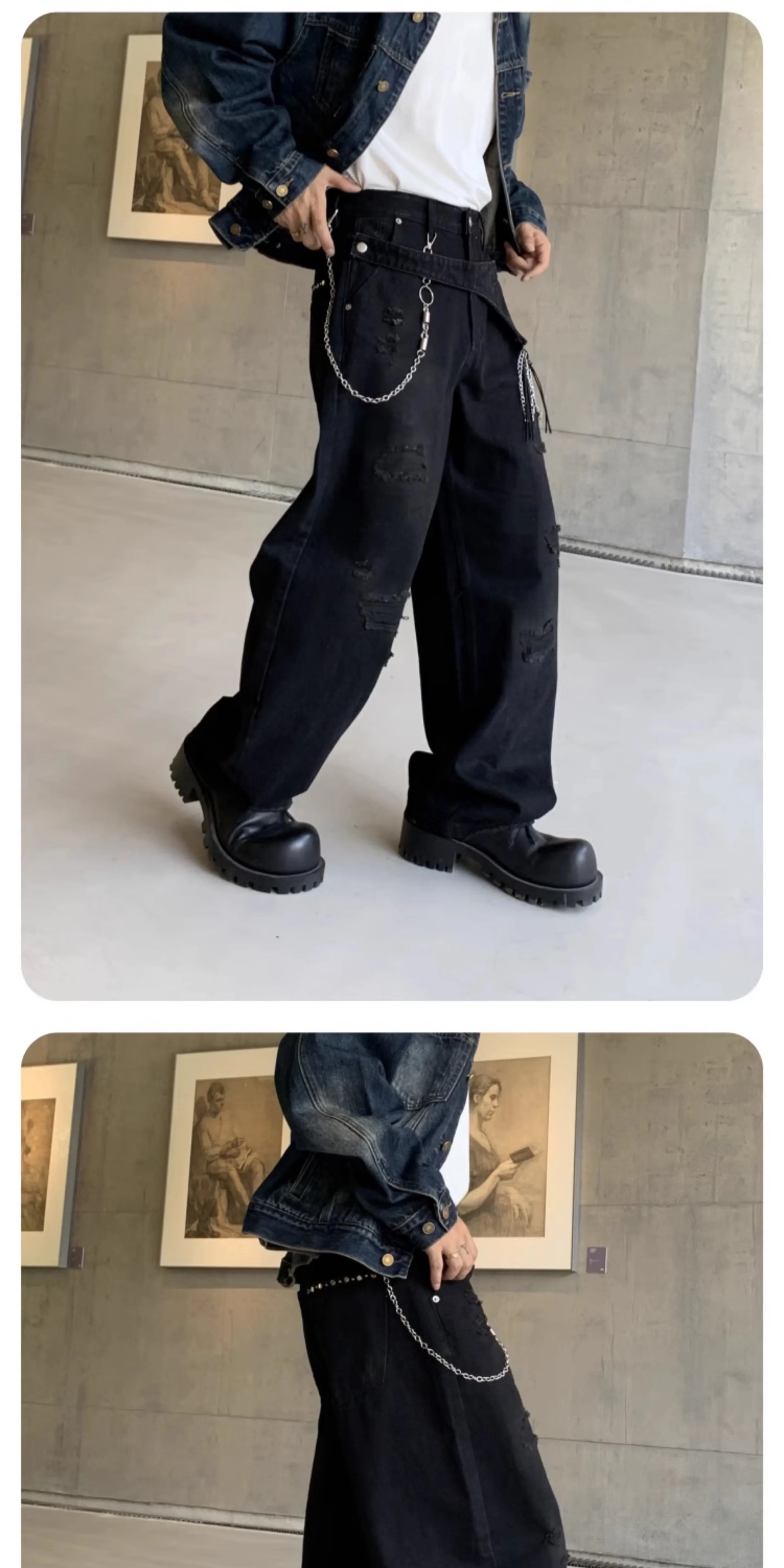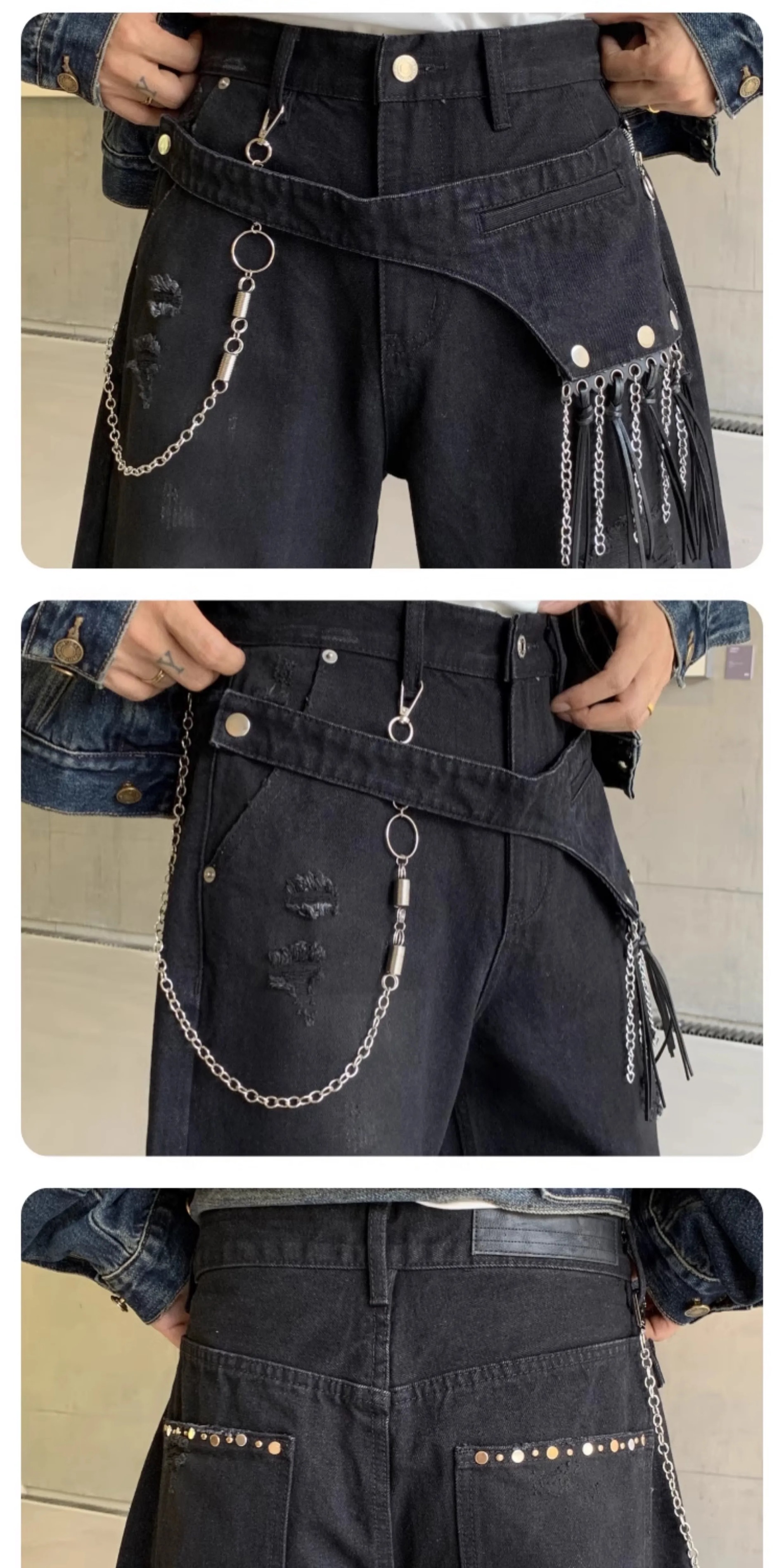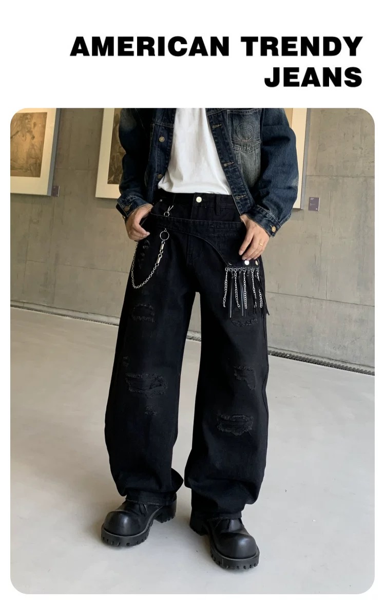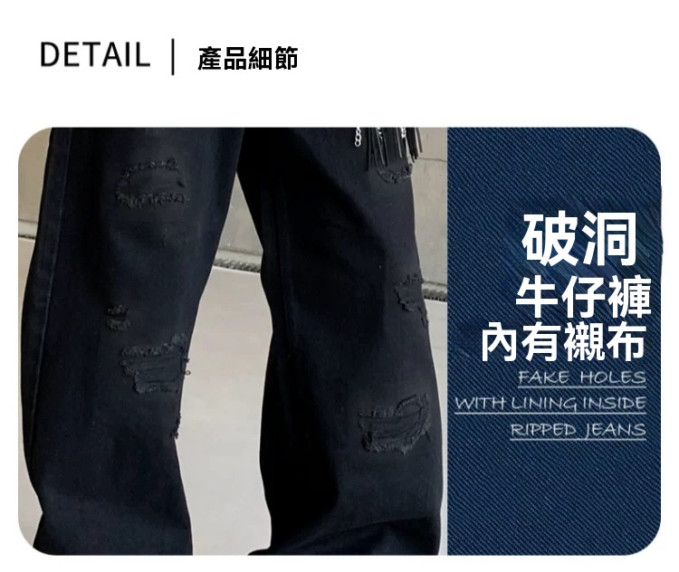 日本岡山巴黎風時裝重工補丁黑牛美式破洞牛仔褲男寬松直筒褲潮牌