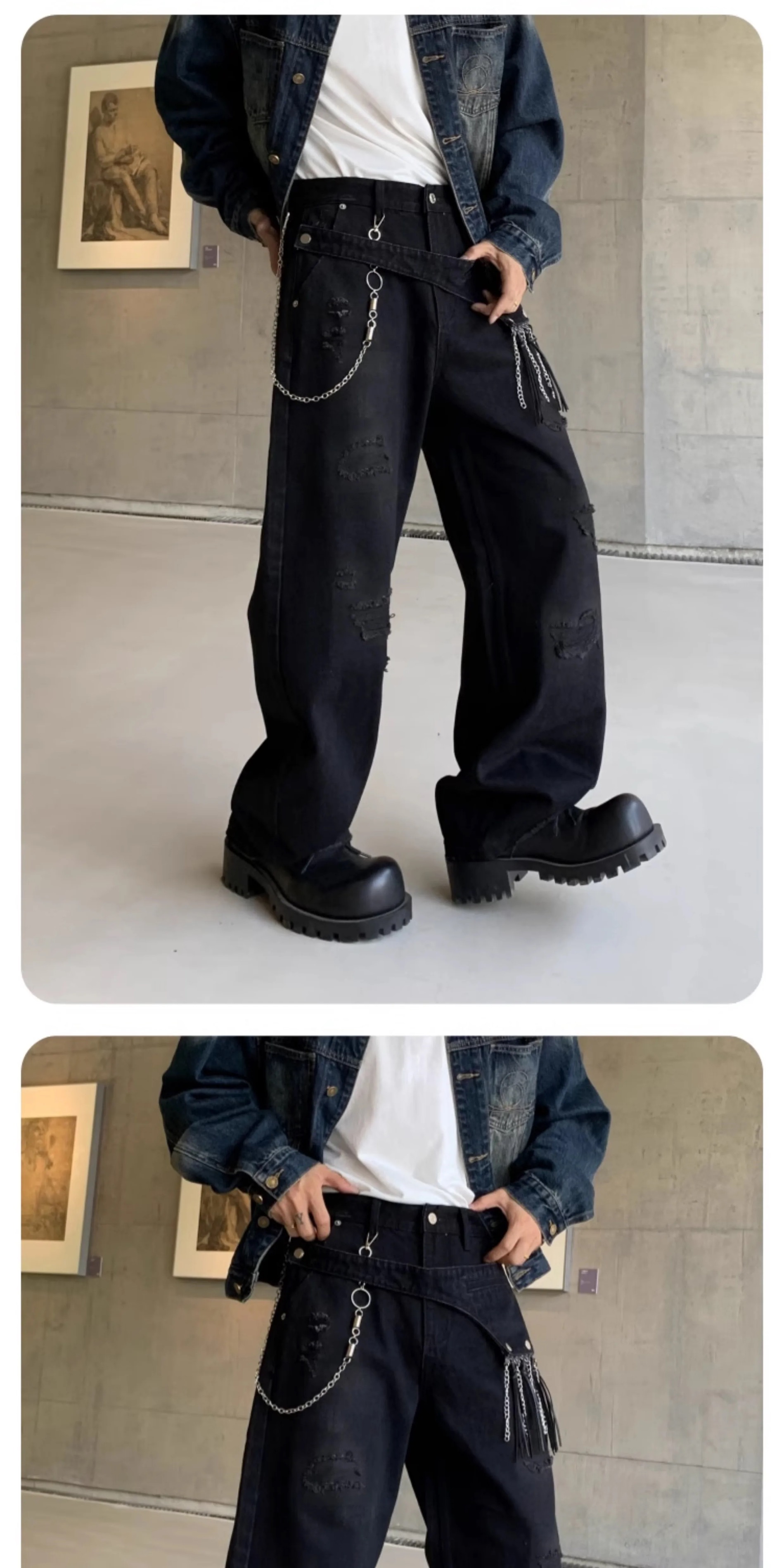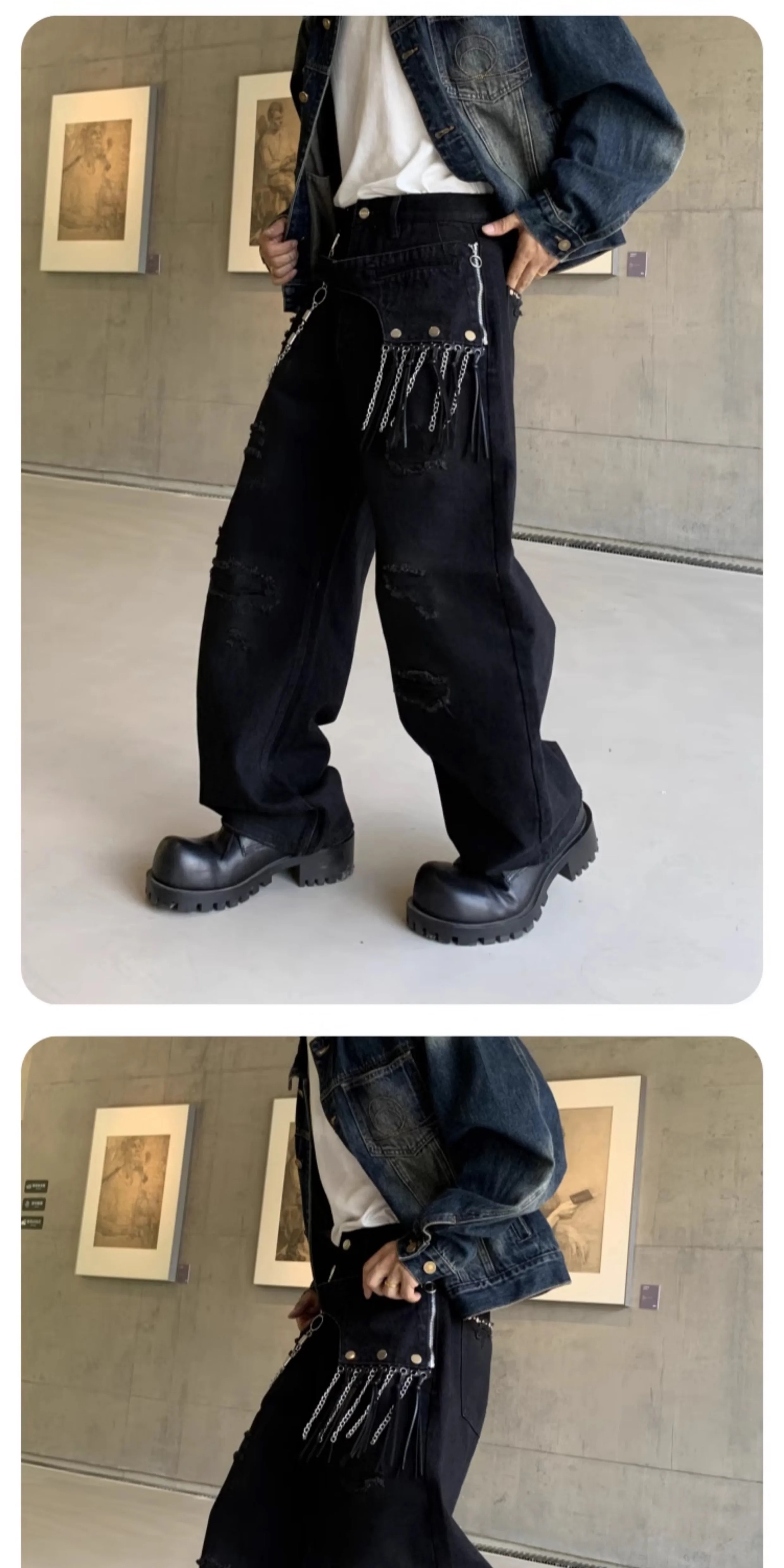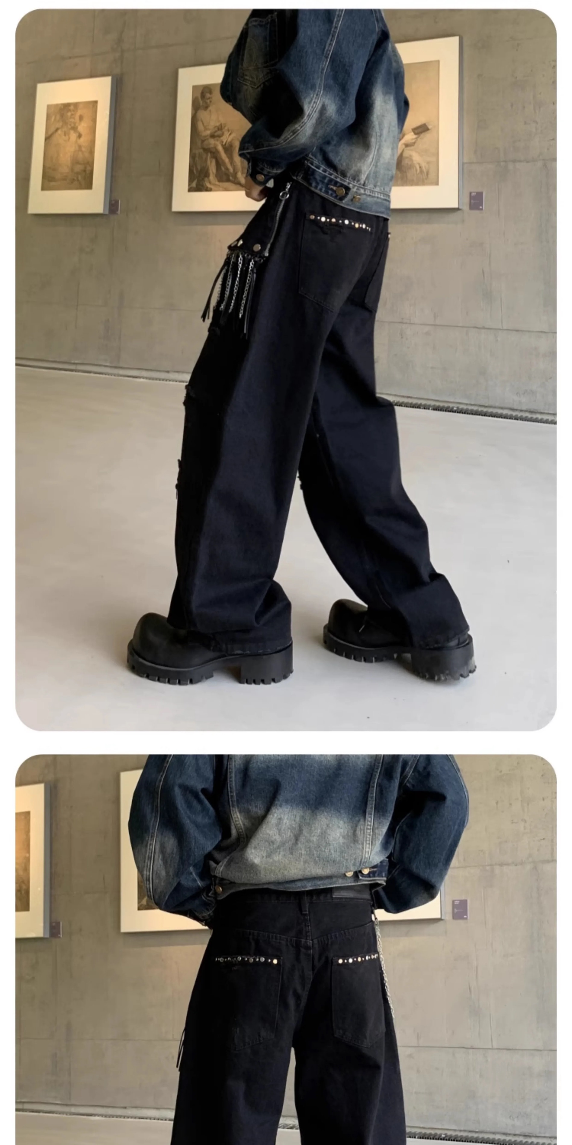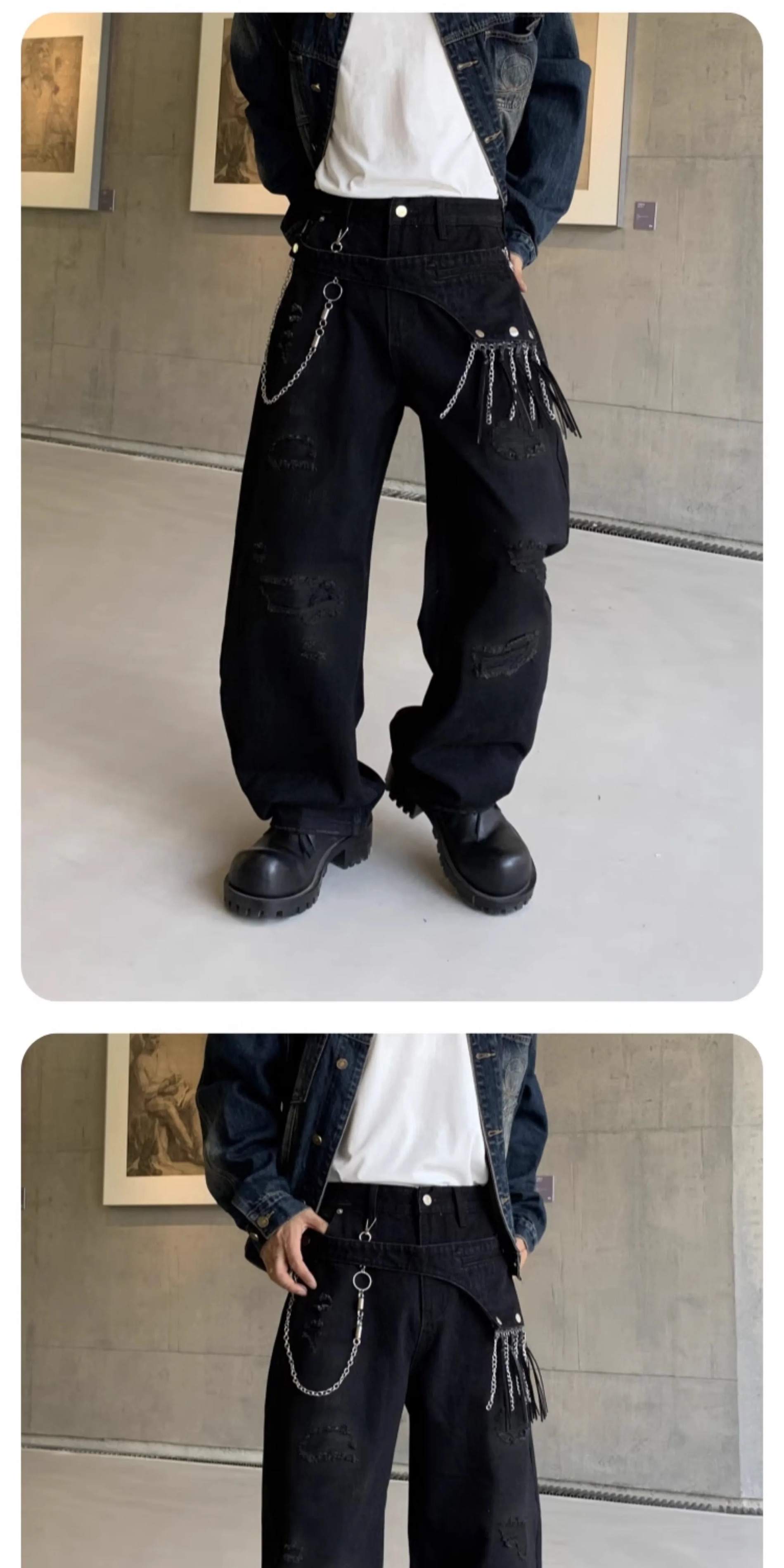 日本岡山巴黎風時裝重工補丁黑牛美式破洞牛仔褲男寬松直筒褲潮牌