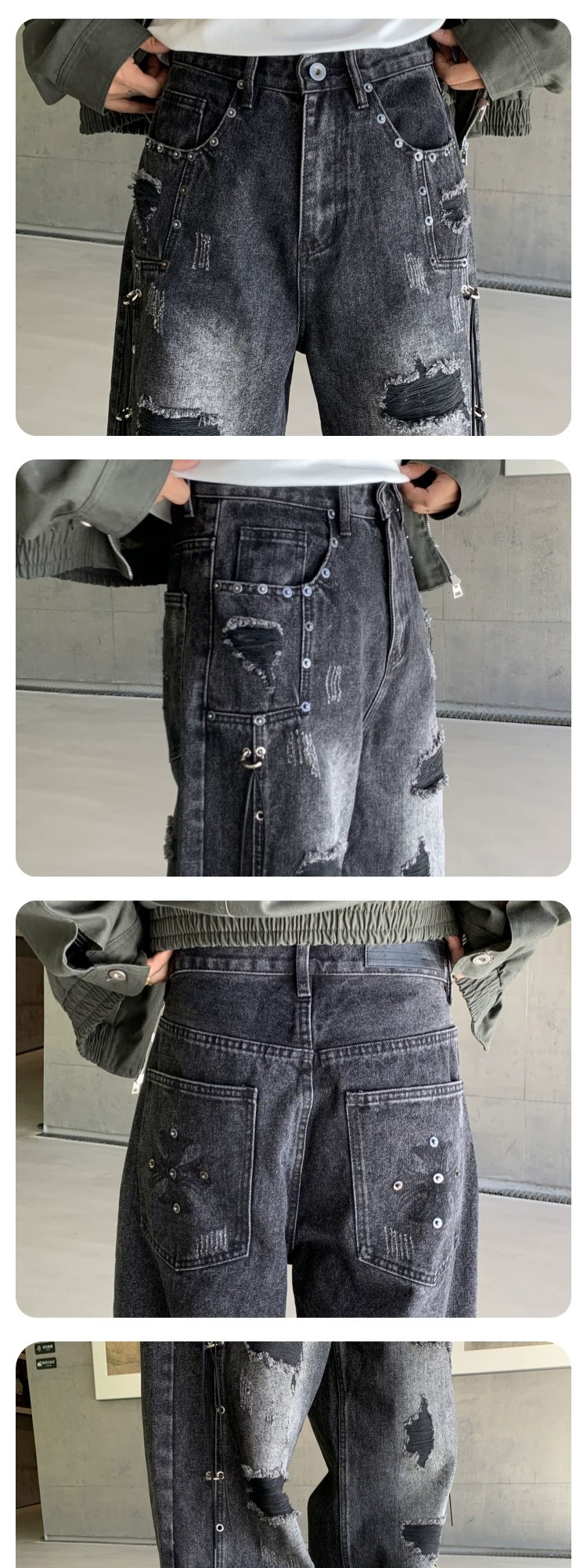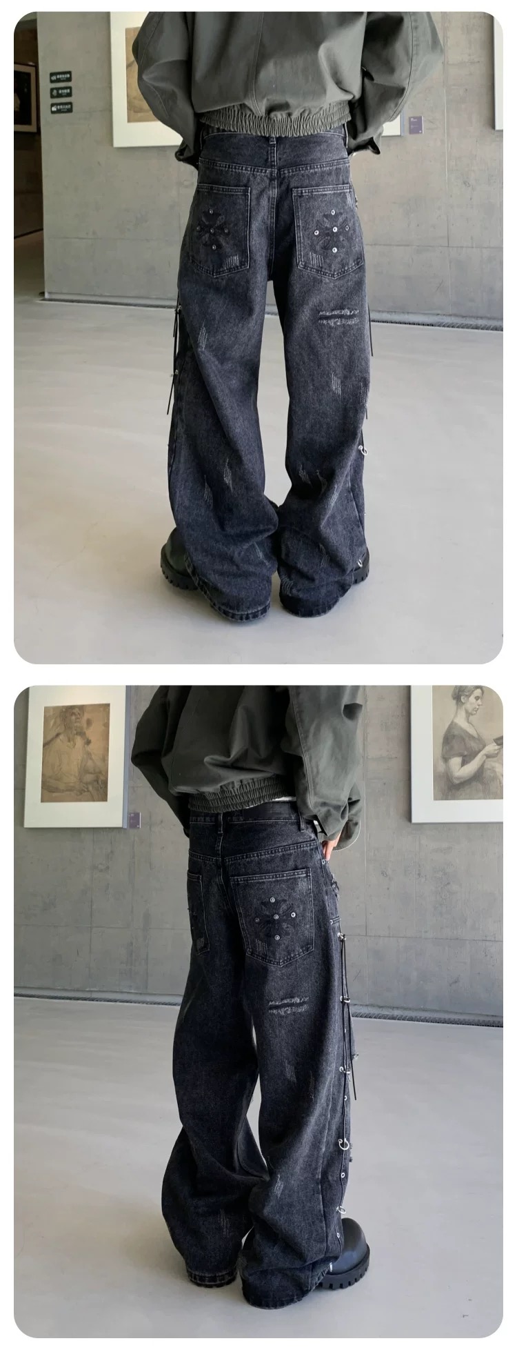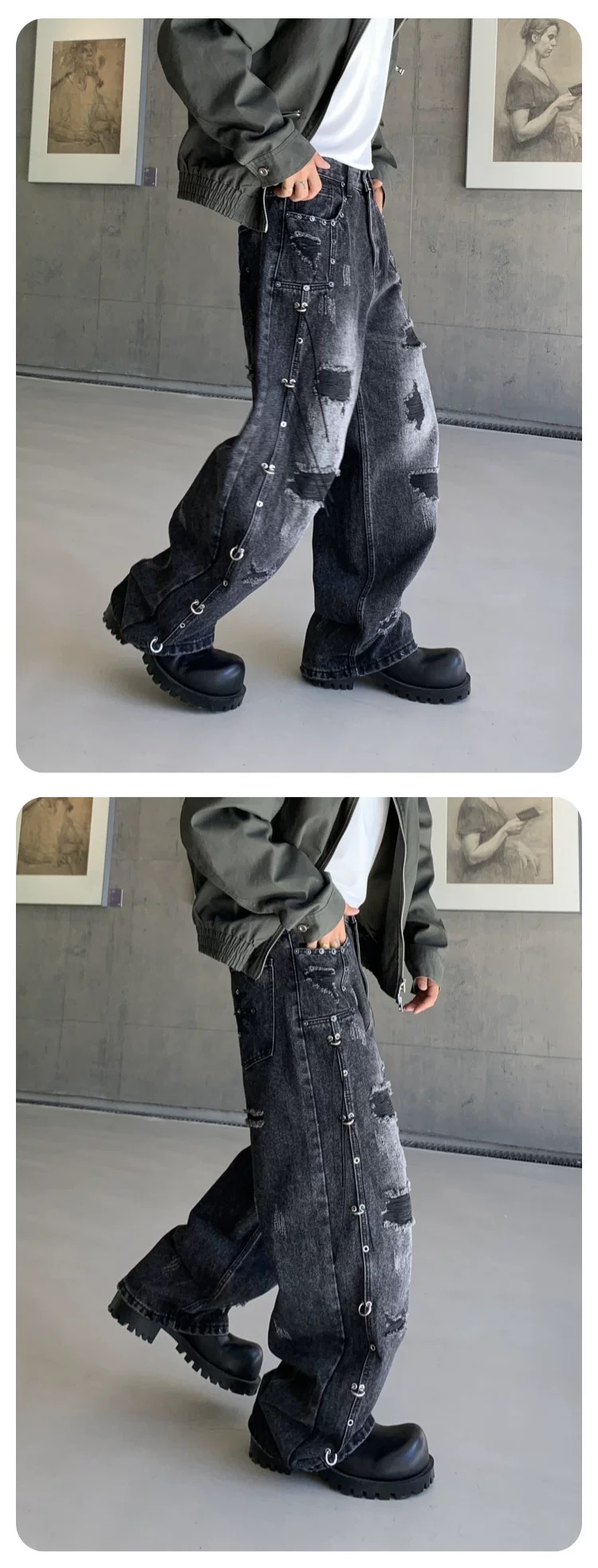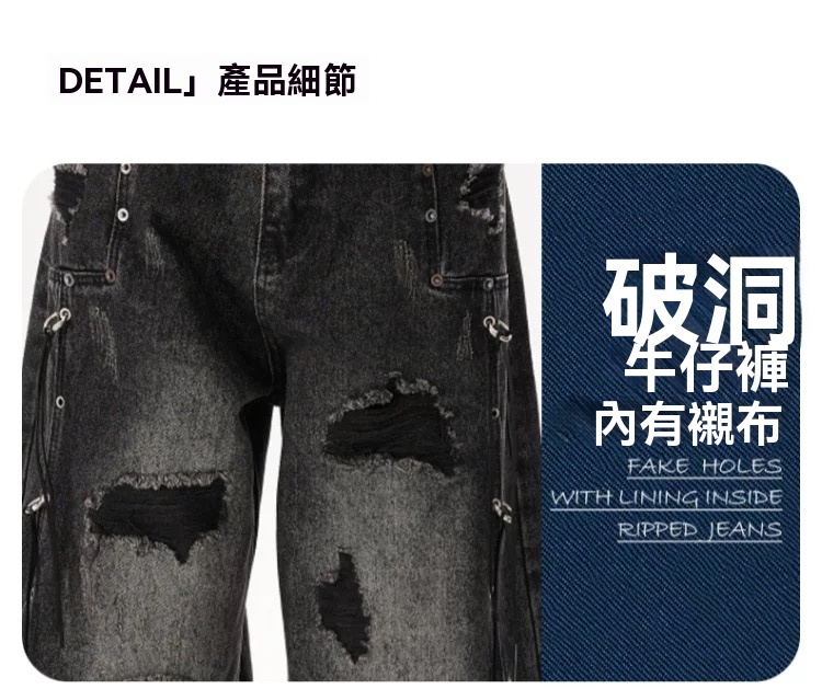 巴黎風美式復古做舊補丁破洞設計牛仔褲男女寬松直筒闊腿休閒長褲
