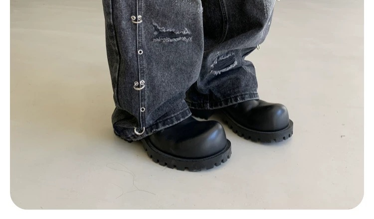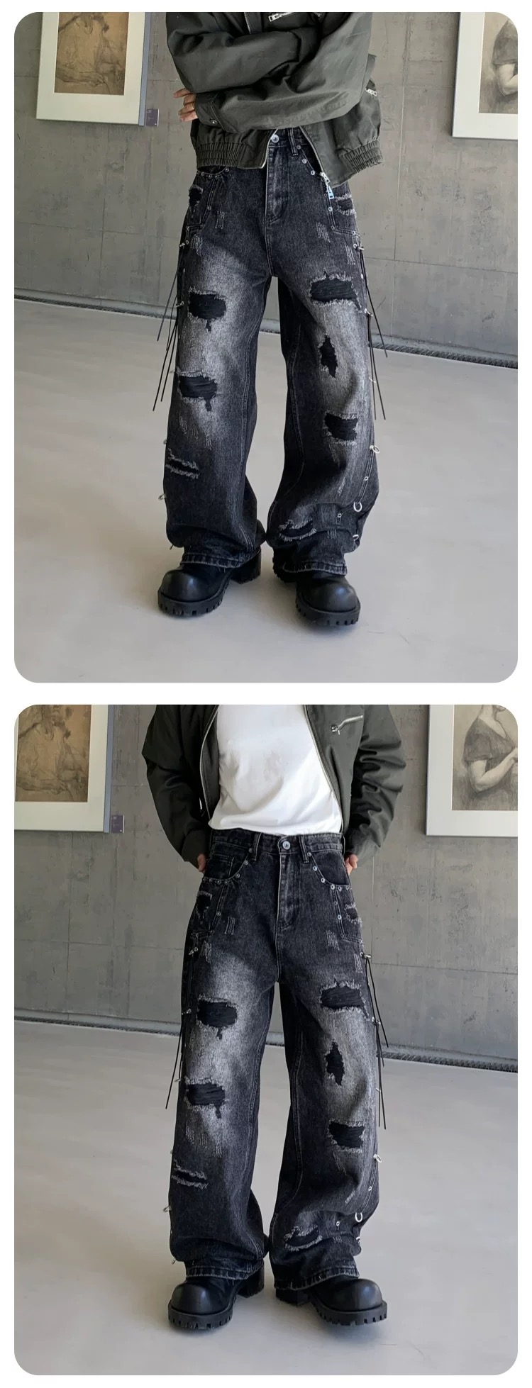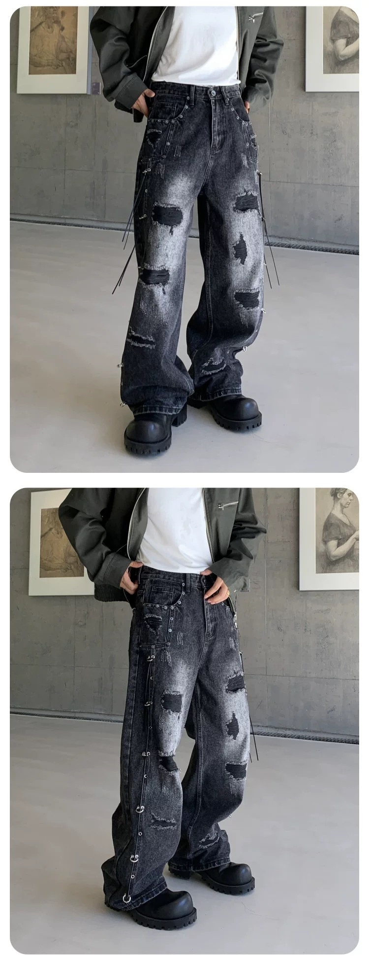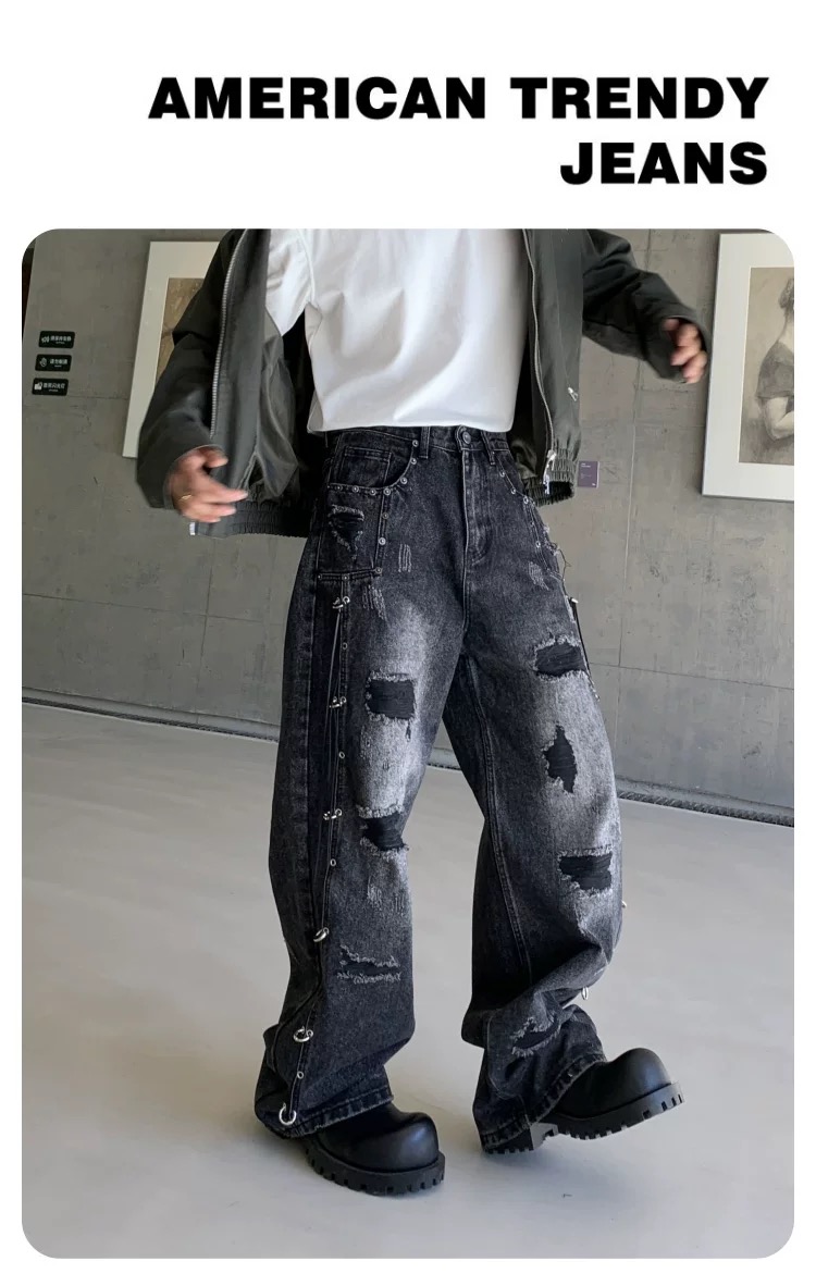 巴黎風美式復古做舊補丁破洞設計牛仔褲男女寬松直筒闊腿休閒長褲