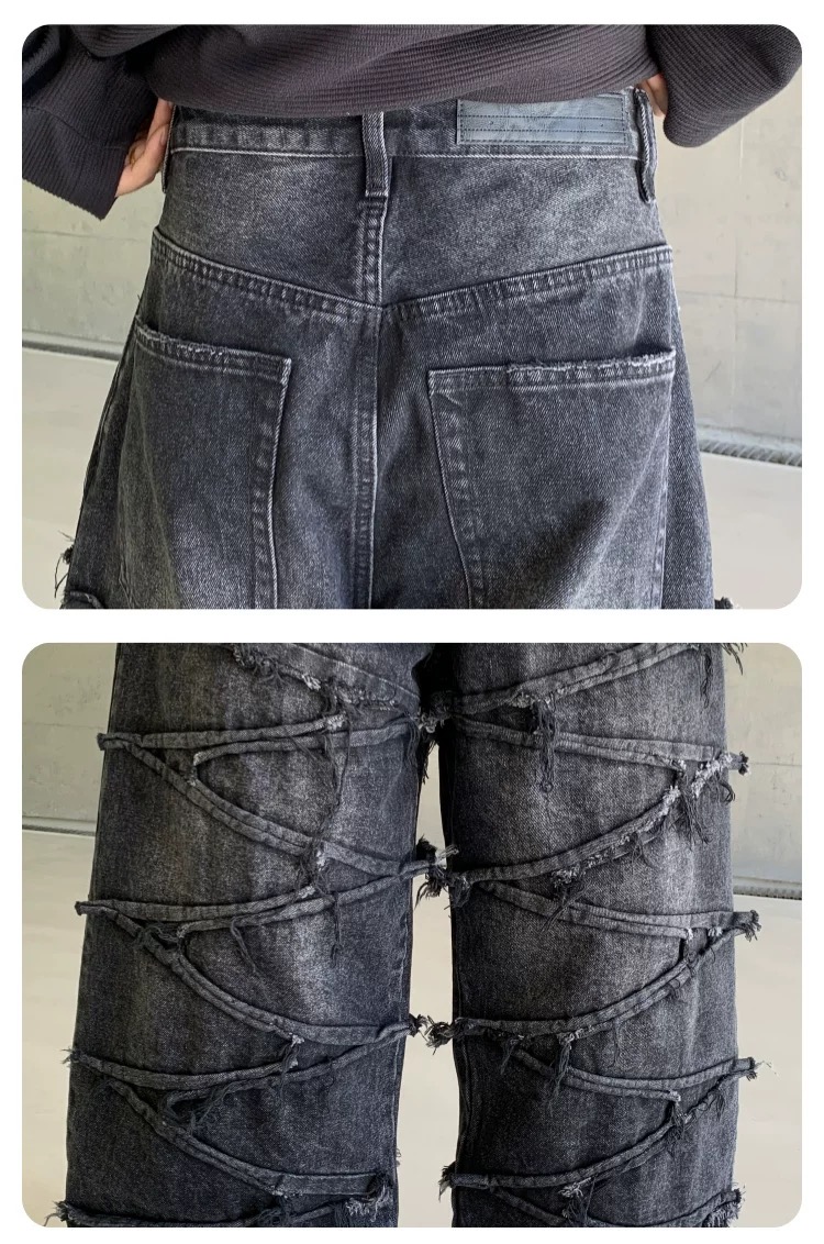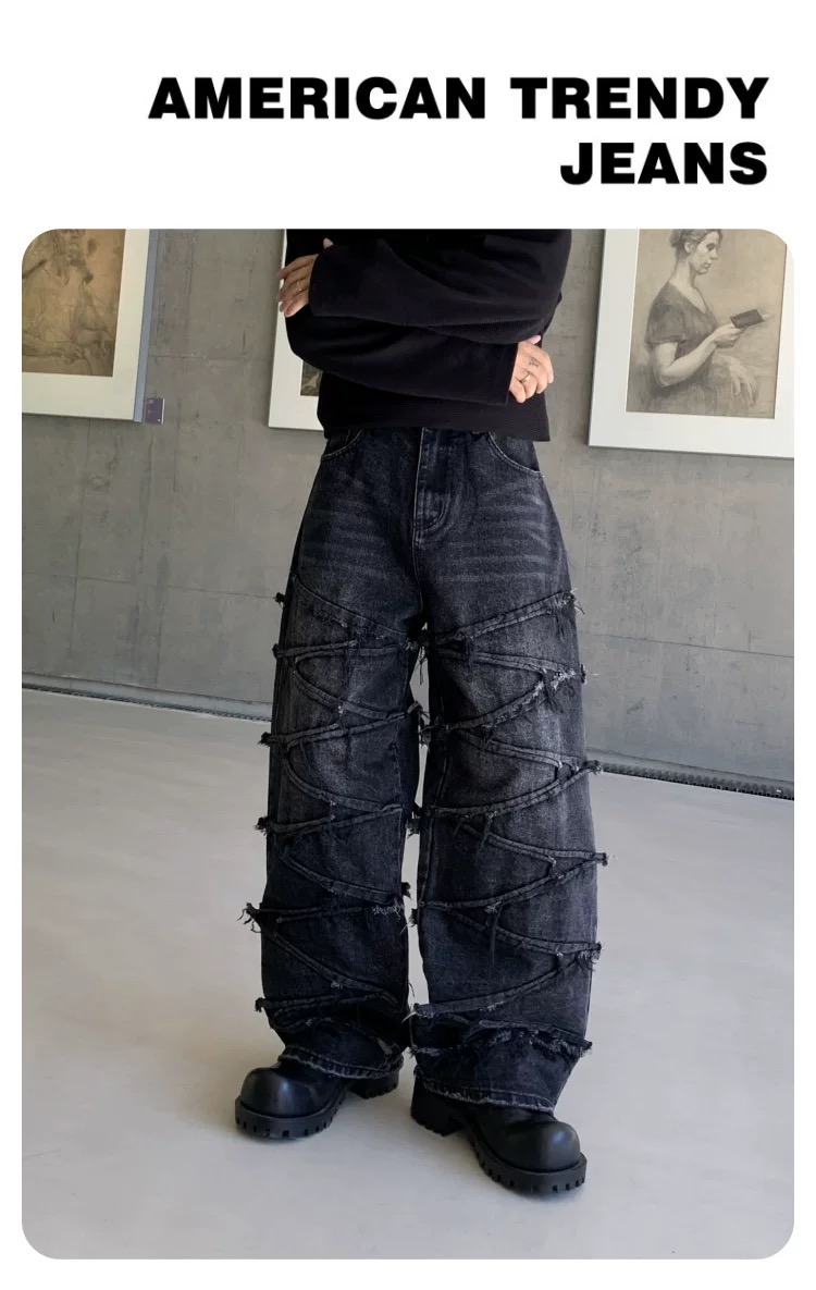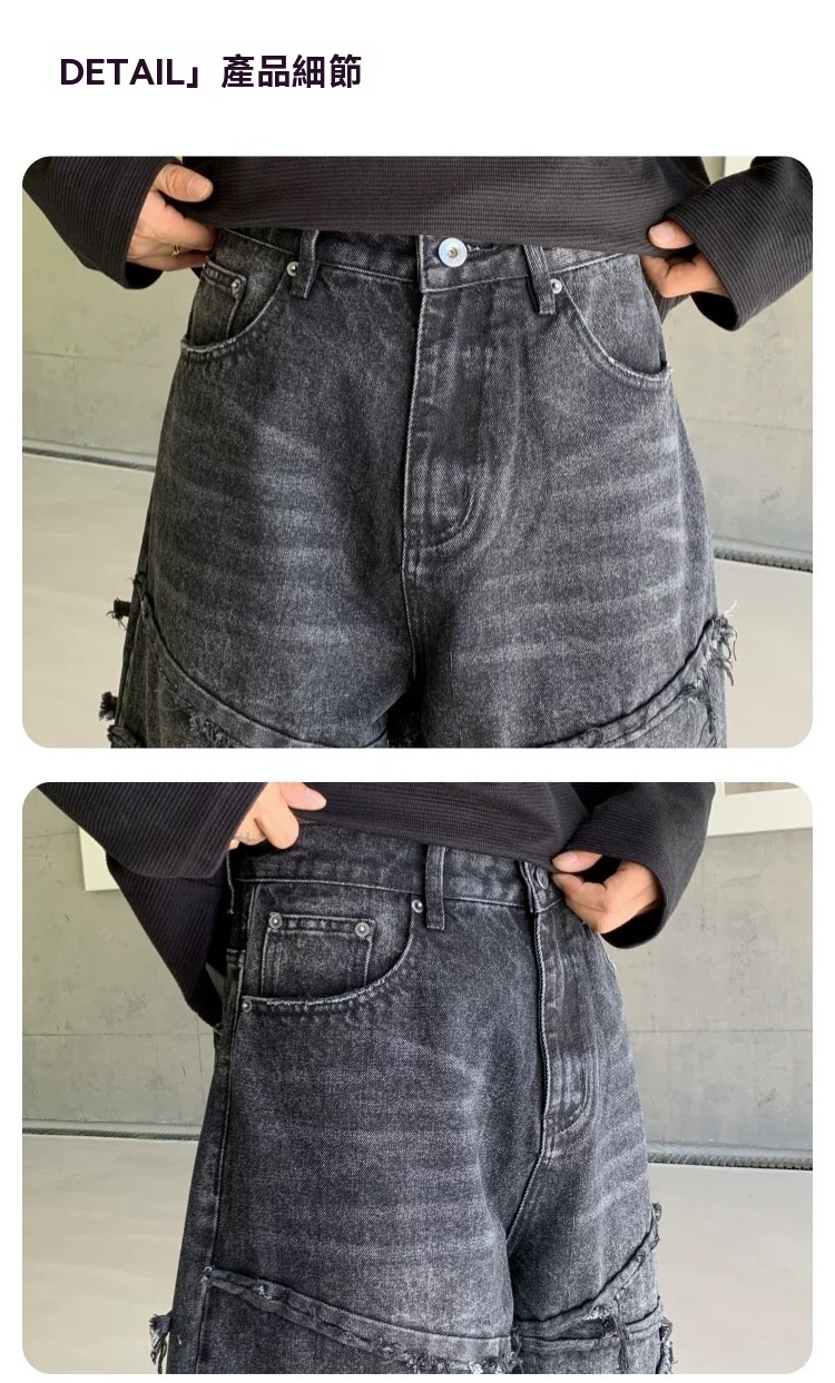 巴黎風同款潮牌復古設計拼接牛仔褲美式寬松個性做舊直筒長褲