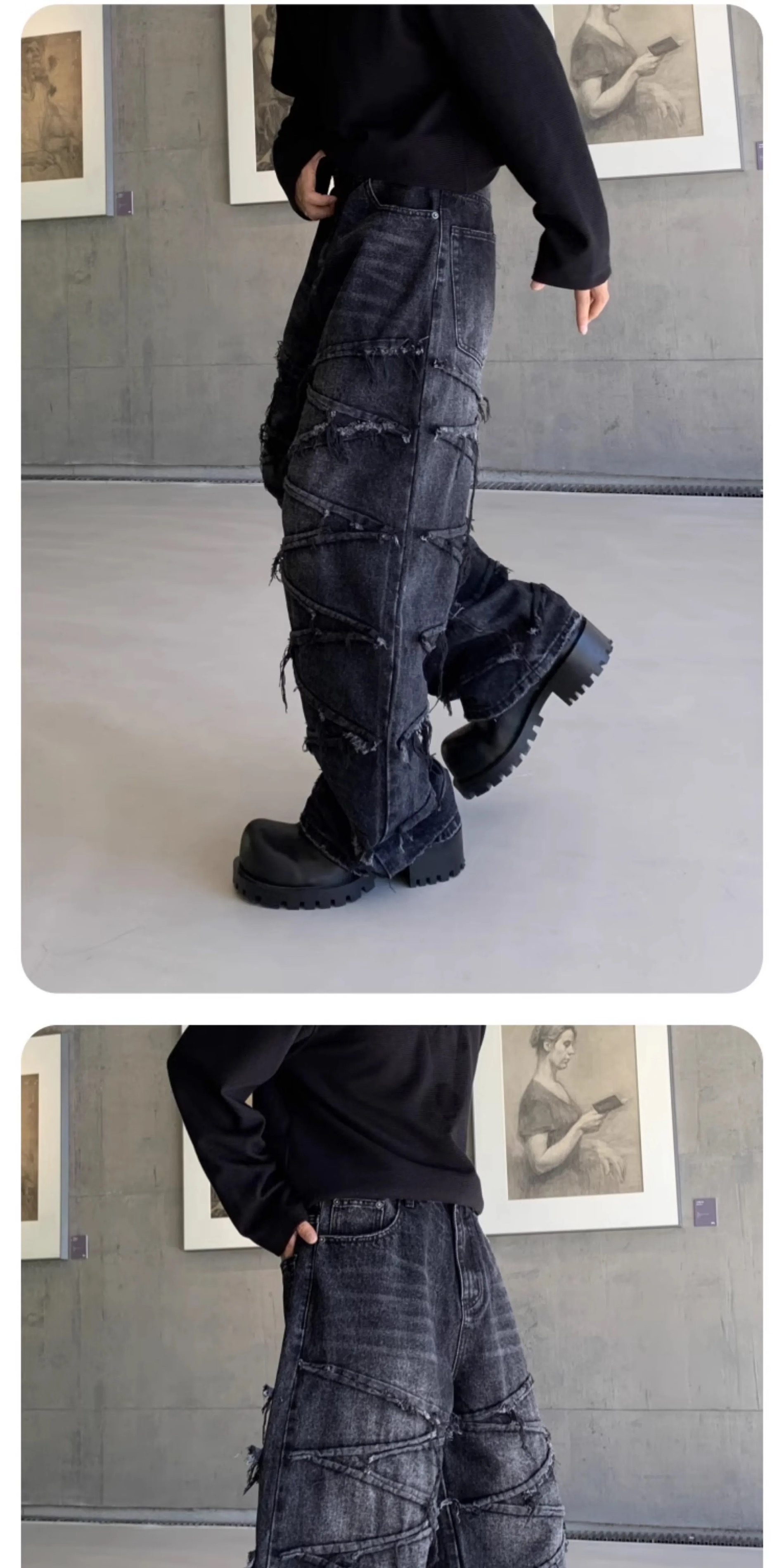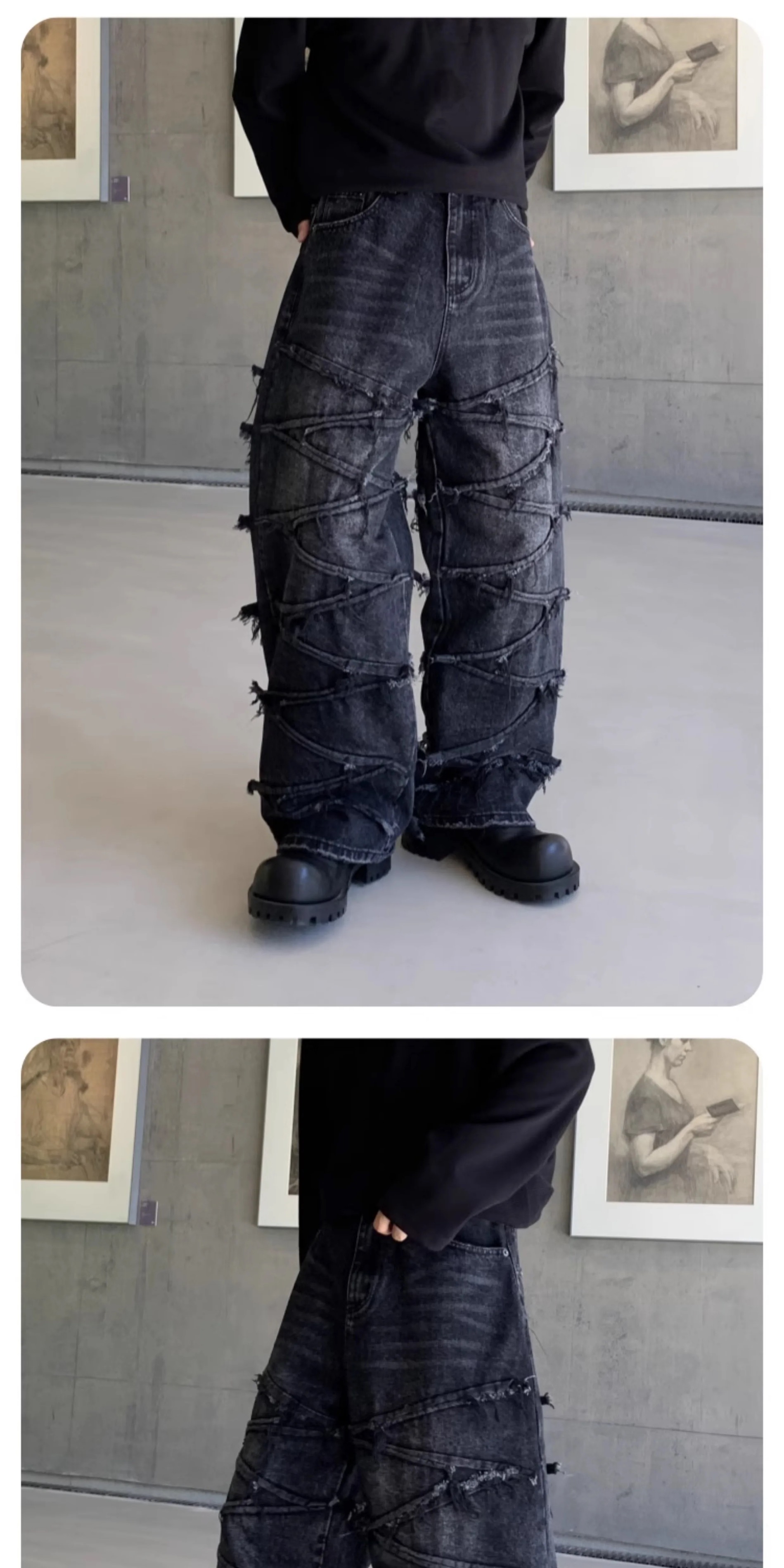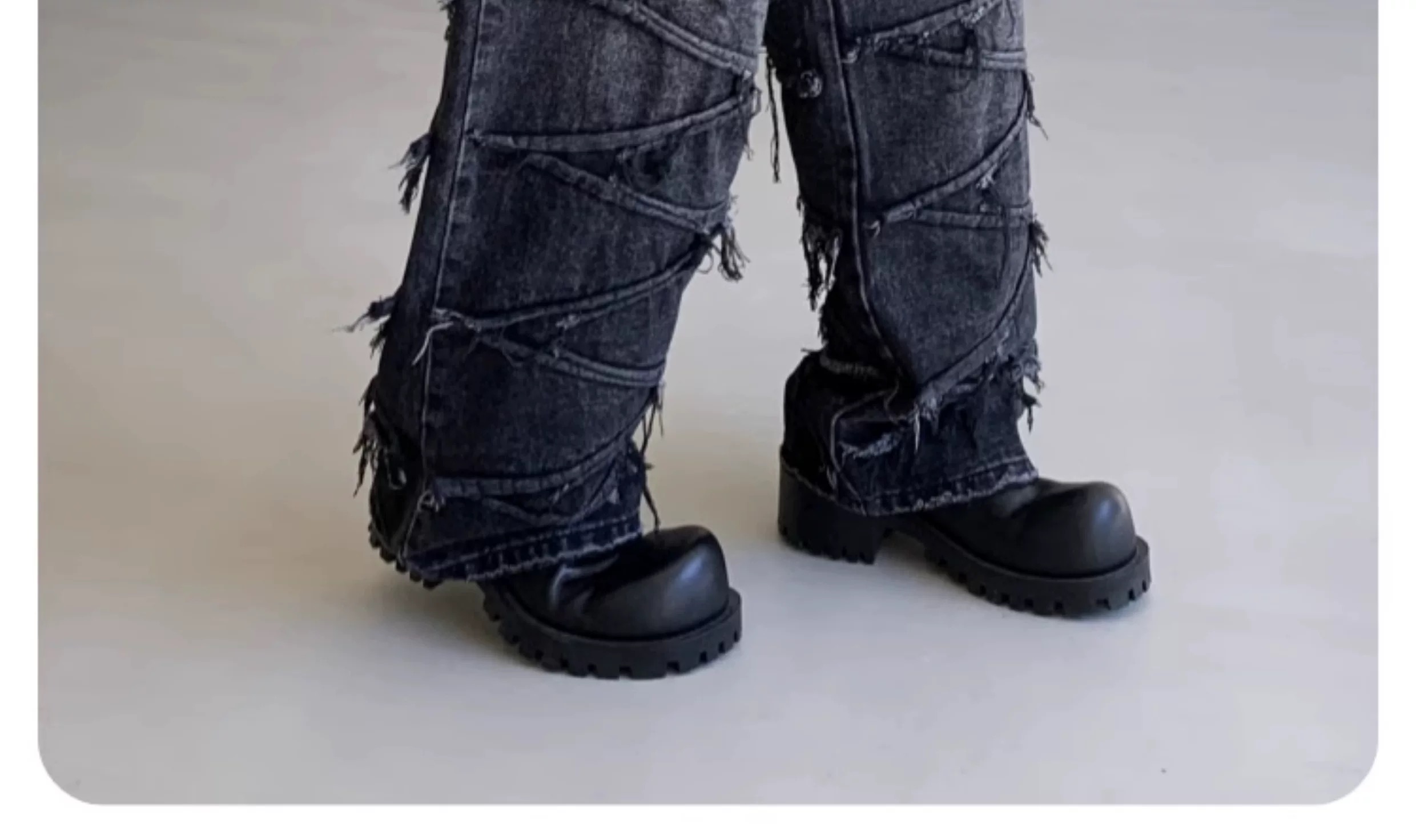 巴黎風同款潮牌復古設計拼接牛仔褲美式寬松個性做舊直筒長褲