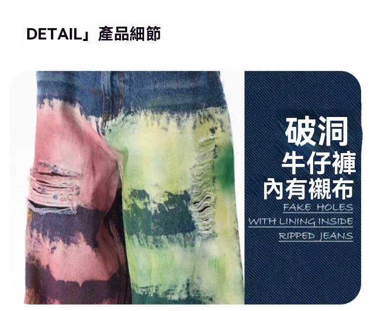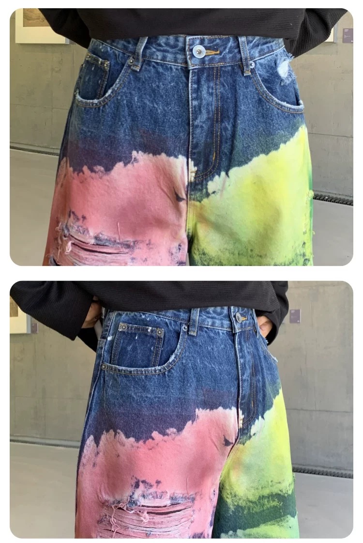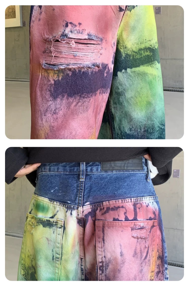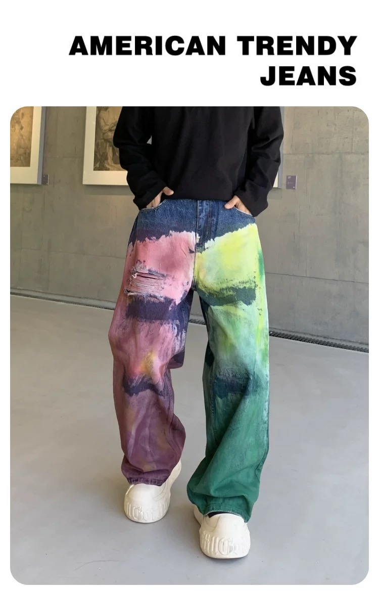 美式潮牌彩色潑墨牛仔褲男秋冬新款嘻哈風寬松扎染直筒褲子