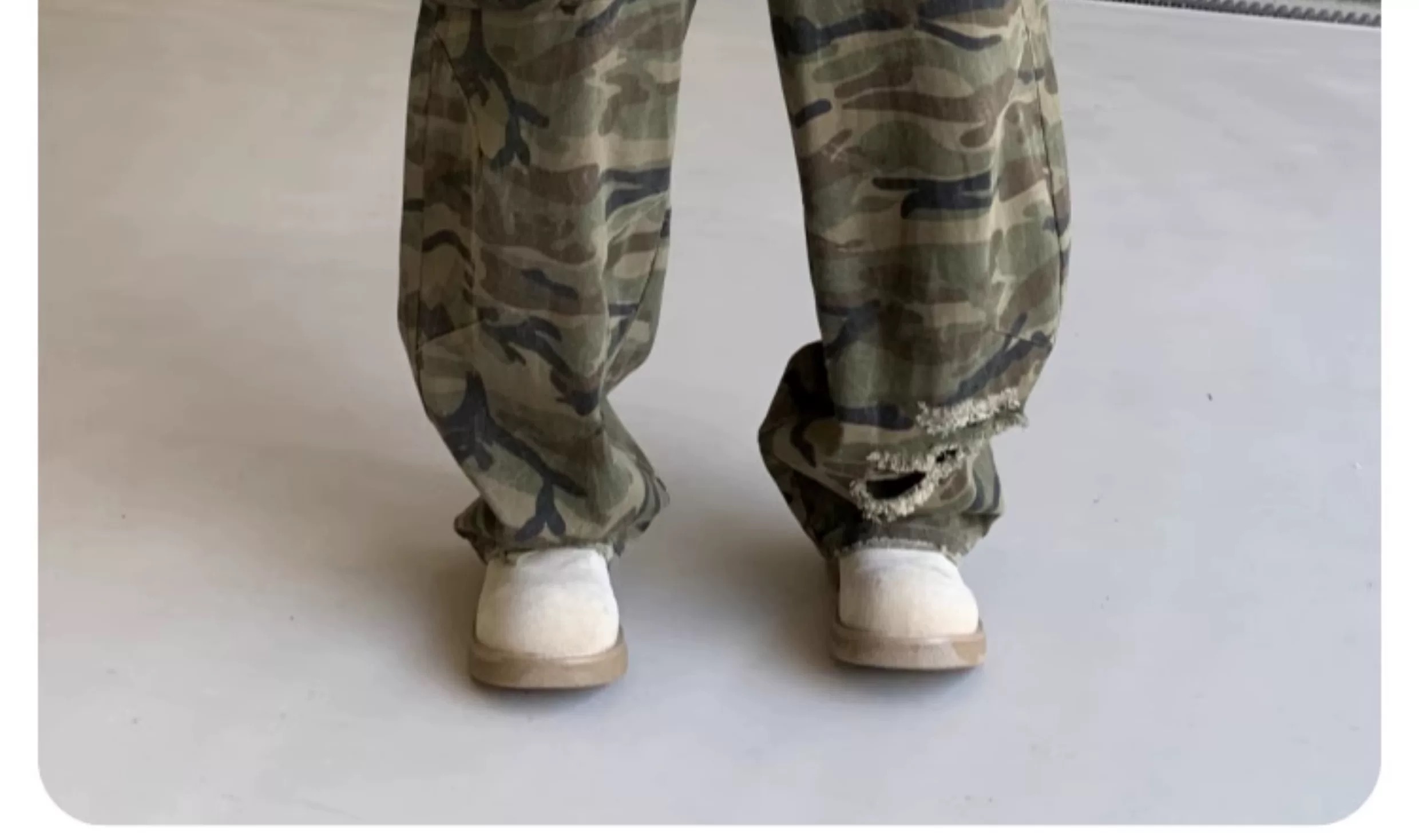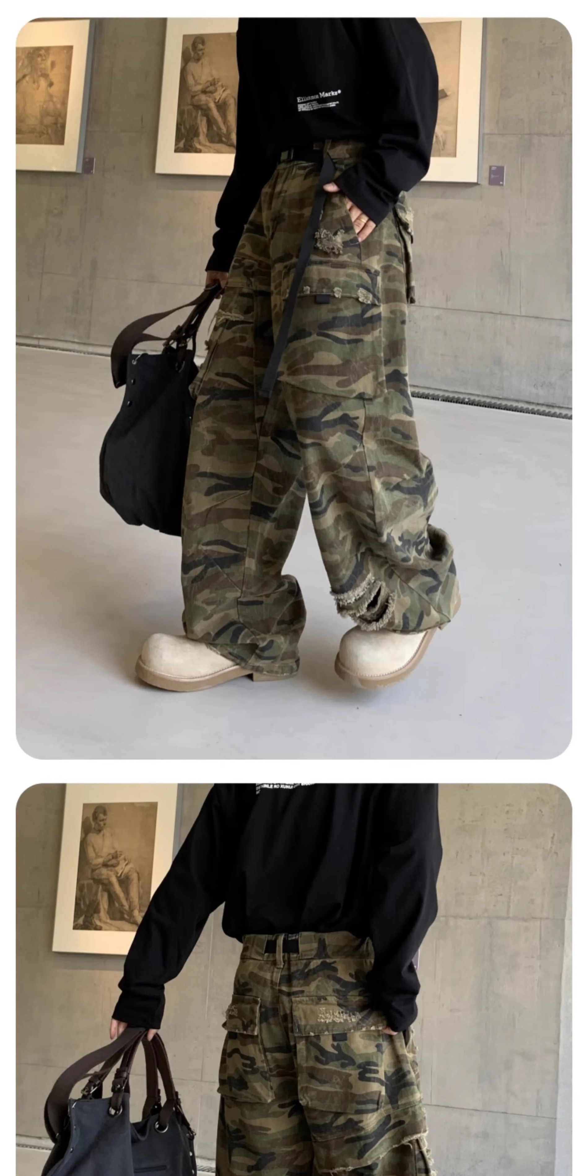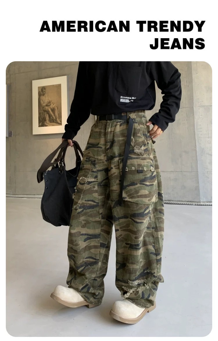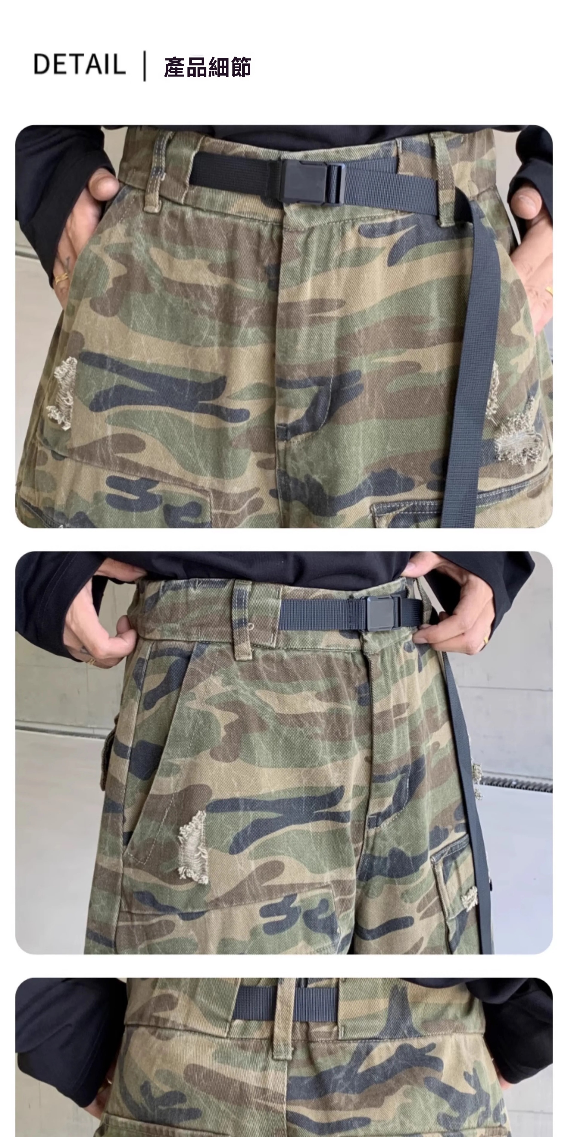 巴黎風格破洞多口袋迷彩工裝褲男美式潮牌寬松直筒闊腿彎刀牛仔褲