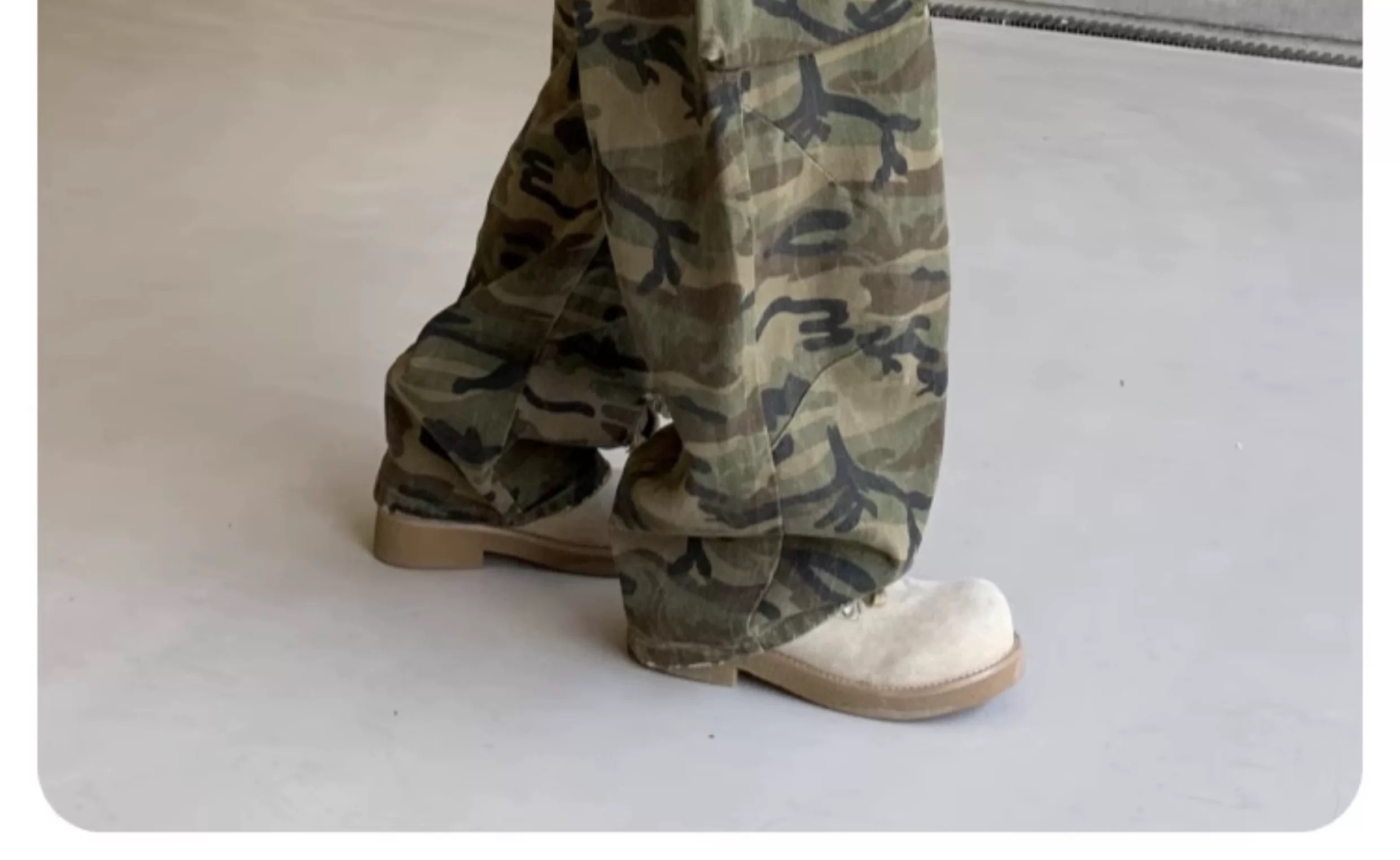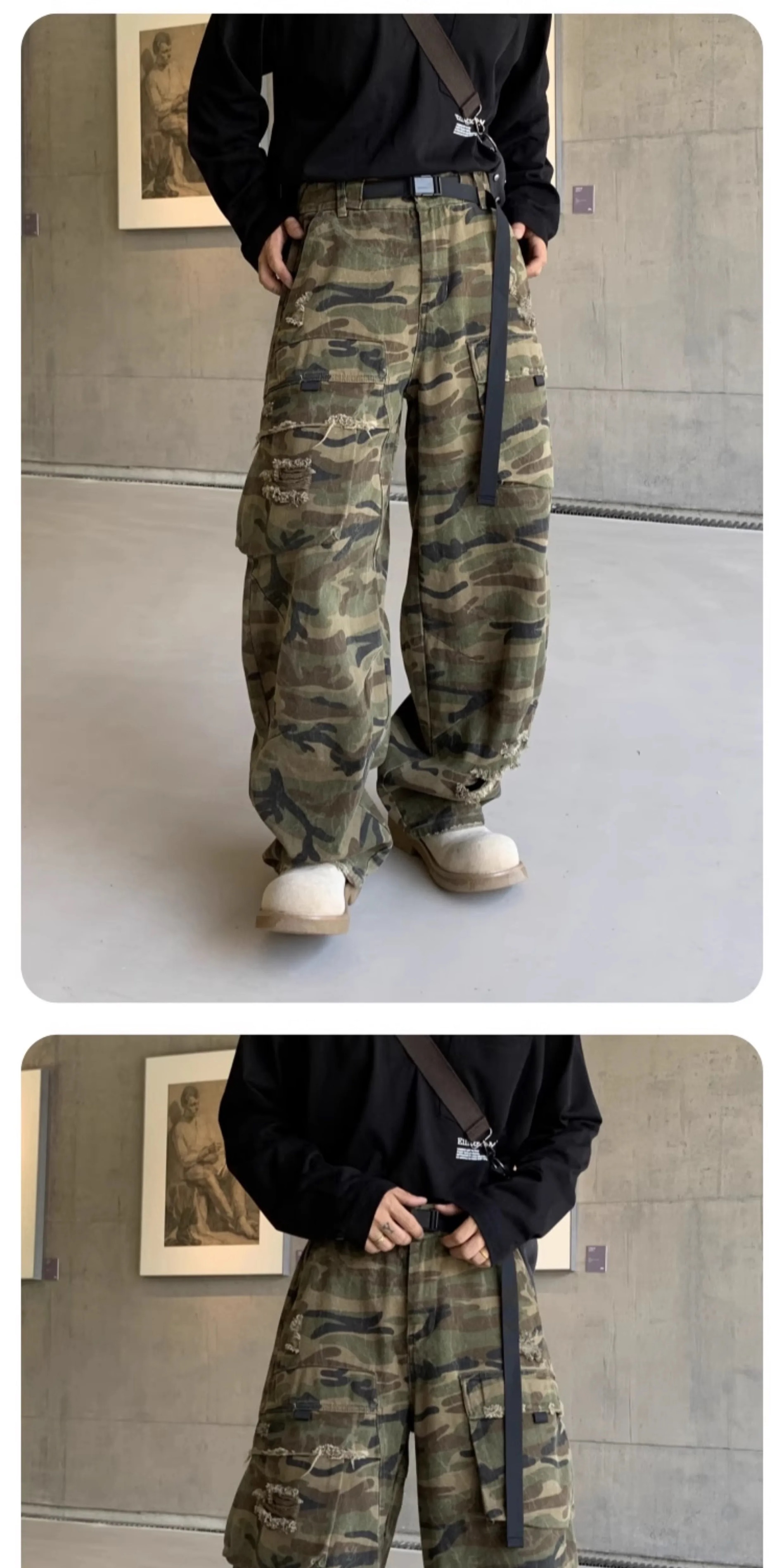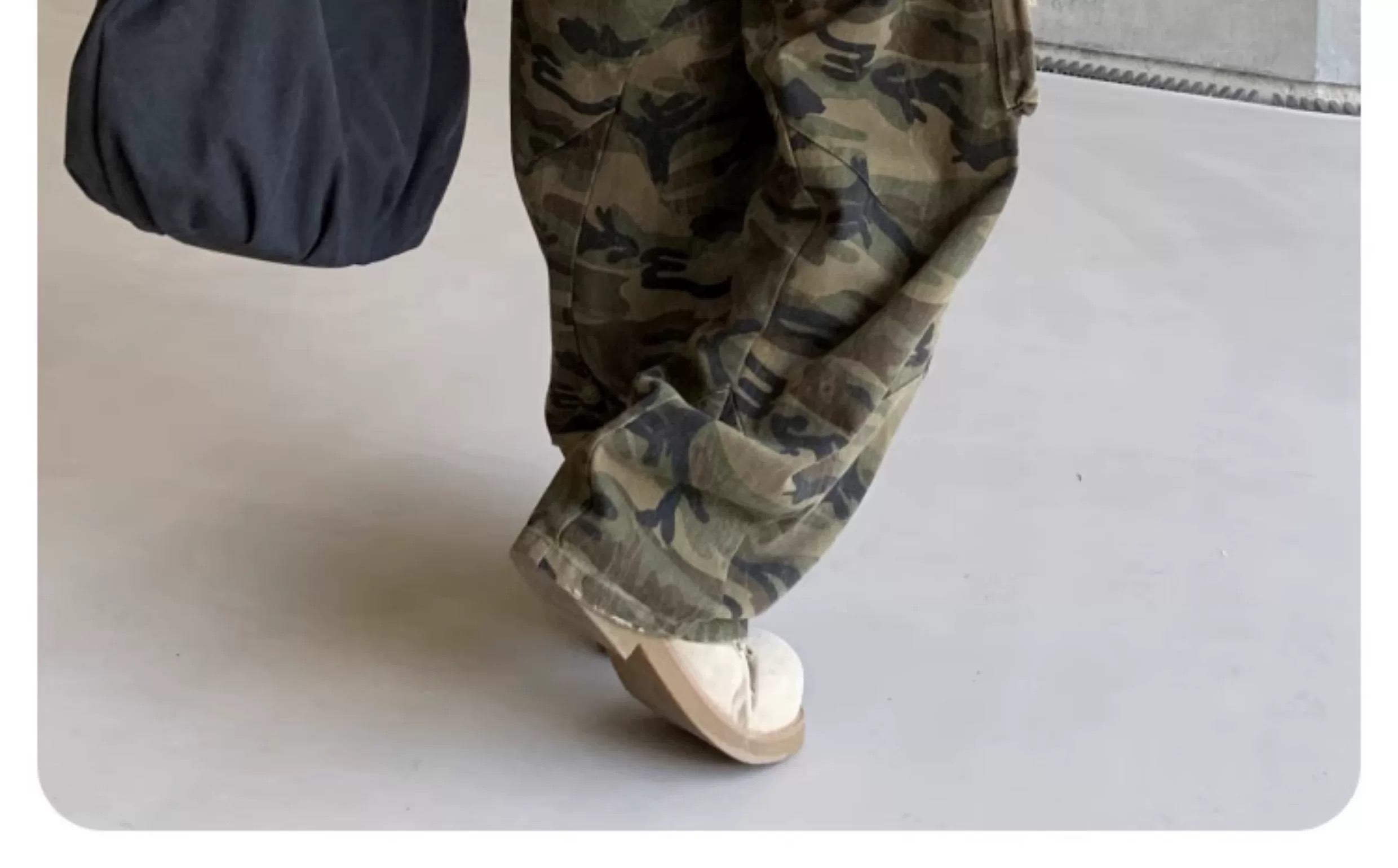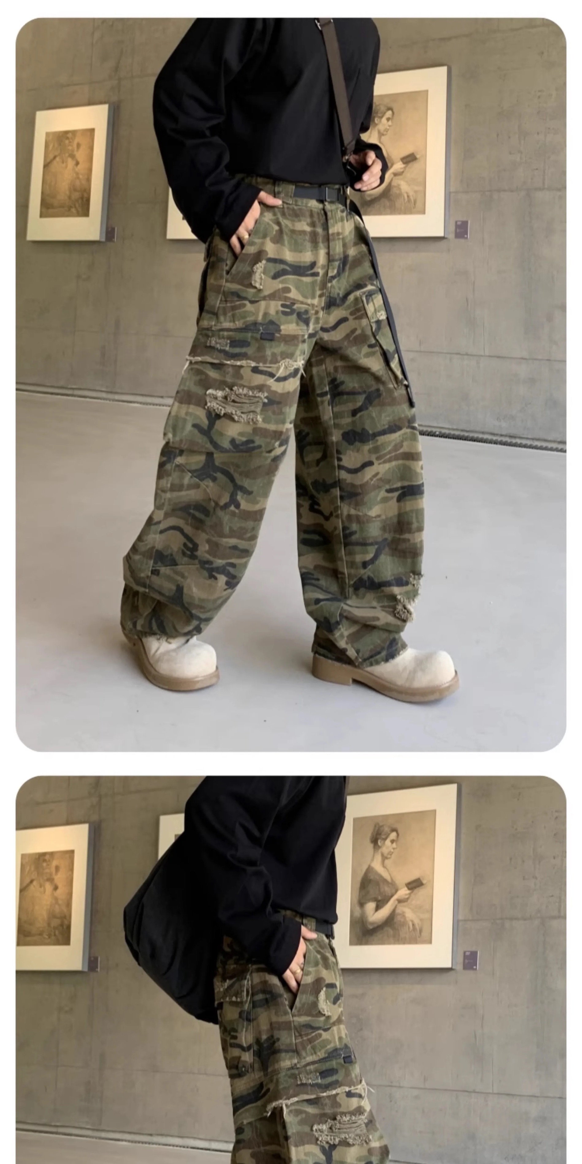 巴黎風格破洞多口袋迷彩工裝褲男美式潮牌寬松直筒闊腿彎刀牛仔褲